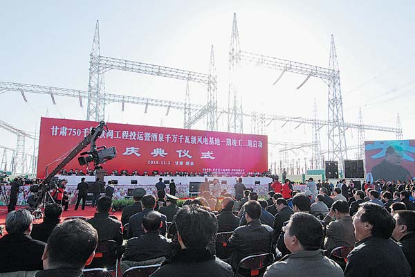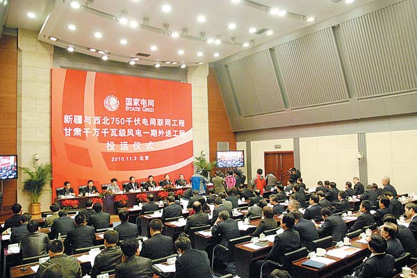 11月3日,在京舉行的新疆與西北750千伏電網(wǎng)聯(lián)網(wǎng)工程暨甘肅千萬千瓦級風(fēng)電一期外送工程投運儀式。