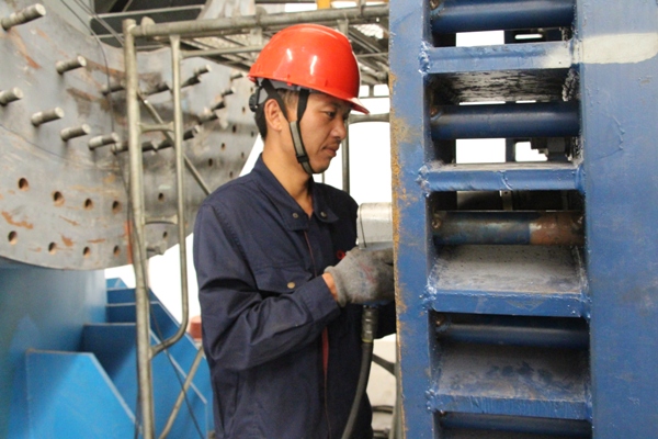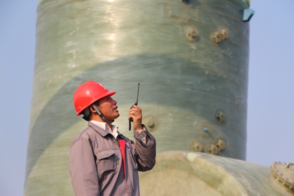 “張斯偉,你們班生產(chǎn)情況如何,有沒(méi)有人員中暑?”“報(bào)告熊經(jīng)理,人員一切正常,保證下班前完成MK-09號(hào)罐體纏繞結(jié)束”纏繞班長(zhǎng)張斯偉用手抹了一把臉上的汗水答道。 “范成雷,現(xiàn)場(chǎng)情況如何,今晚能否完成1號(hào)平臺(tái)的法蘭對(duì)接?”“報(bào)告熊經(jīng)理,人員一切正常,保證今晚保質(zhì)保量的完成任務(wù)”,手糊二班范成磊回答道。像這樣的詢(xún)問(wèn)和關(guān)心還有很多很多,不管是在室溫高達(dá)四十二度的纏繞車(chē)間還是在六十二米高的玻璃鋼煙囪手糊對(duì)接處,你都能看到虎山項(xiàng)目部經(jīng)理熊?chē)?guó)慶的身影。