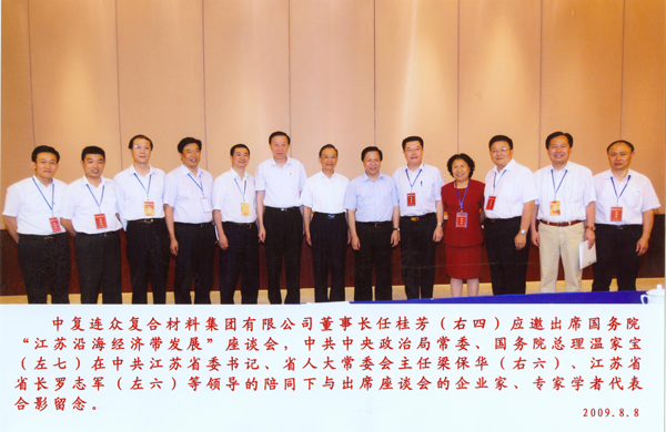 8月8日,中共中央政治局常委、國務(wù)院總理溫家寶在江蘇考察調(diào)研,并召開國務(wù)院“江蘇沿海經(jīng)濟帶發(fā)展”座談會,就江蘇沿海地區(qū)的經(jīng)濟發(fā)展廣泛聽取了連云港、鹽城、南通部分重點企業(yè)負責人和專家的意見。中國復合材料集團有限公司副總經(jīng)理、連云港中復連眾復合材料集團有限公司董事長任桂芳作為重點企業(yè)家代表應邀出席,并合影留念。