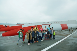 上午九點鐘,雖然天空飄著零星細雨,小朋友的熱情卻很高漲。大家統(tǒng)一乘坐大客車來到連云港葉片工廠,參觀一分廠、二分廠的辦公區(qū)域,葉片貨場,檢測中心和12兆瓦試驗臺。大人們平時司空見怪的風景,在小朋友充滿好奇的眼里,一切都變得不同。一只只巨大的銀色葉片,靜靜地躺在貨場上,像一架架等候起飛的飛機;12兆瓦試驗臺,兩只正在進行加載試驗的葉片,像一個巨大的變形金剛,抖動著翅膀,隨時準備變身。