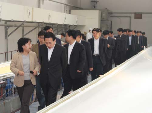 中復連眾董事長任桂芳對黨政代表團的到來表示歡迎,并向來賓介紹了中復連眾風力發(fā)電機葉片項目開展情況。中復連眾于2005年引進1.5兆瓦的風力發(fā)電機葉片技術(shù)后,不斷進行技術(shù)革新,多項技術(shù)填補國內(nèi)空白;2007年底,中復連眾第1000片風力發(fā)電機葉片順利下線,奠定了中復連眾在國內(nèi)兆瓦級風力發(fā)電機葉片領(lǐng)域的龍頭地位;2008年中復連眾將完成年產(chǎn)750套的目標。中復連眾除繼續(xù)建設大浦三期工程外,沈陽、酒泉等葉片生產(chǎn)基地也在緊張的建設中,預計到2008年底,中復連眾將具有1800套風力發(fā)電機葉片產(chǎn)能。