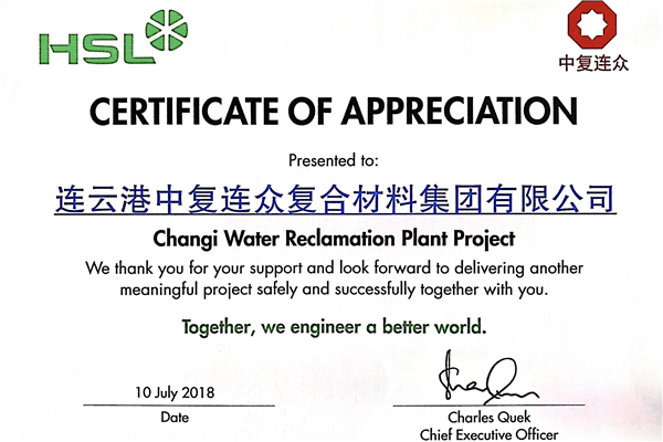 2018年7月9-11日,新加坡水處理博覽會(huì)在金沙國(guó)際會(huì)展中心舉行。展會(huì)上,HSL公司CEO Charles Quek先生向中復(fù)連眾總經(jīng)理助理、管道公司經(jīng)理?xiàng)顫善筋C發(fā)了感謝證書,對(duì)中復(fù)連眾在新加坡大型污水處理廠項(xiàng)目中的優(yōu)異表現(xiàn)表示感謝。同時(shí),HSL公司和中復(fù)連眾簽訂了長(zhǎng)期合作備忘錄,雙方將進(jìn)一步開展深度合作。