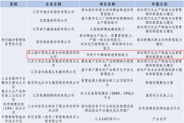 2018年8月10日,工信部公布了《2018年制造業(yè)與互聯(lián)網(wǎng)融合發(fā)展試點(diǎn)示范項(xiàng)目名單》,項(xiàng)目總計立項(xiàng)125個,江蘇省11個項(xiàng)目入圍。其中,中復(fù)連眾所申報的“風(fēng)電葉片精益制造管控能力” 項(xiàng)目成功入選兩化融合管理體系貫標(biāo)示范項(xiàng)目。