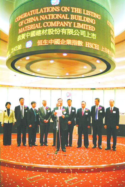 國家發(fā)改委、國資委、中國建材協(xié)會、中國水泥協(xié)會及相關(guān)政府部門領(lǐng)導(dǎo)、中國建材董事、監(jiān)事、高管人員、股東單位代表、國內(nèi)建材行業(yè)代表、金融業(yè)代表、證券機構(gòu)代表、合作單位代表,以及香港社會各界人士代表參加了當天的上市掛牌儀式。