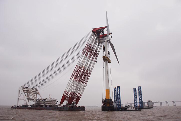 據(jù)中國風力發(fā)電網(wǎng)專家介紹,東海大橋風電場采用了世界首創(chuàng)的高樁承臺基礎(chǔ)設(shè)計和中國首創(chuàng)的海上風機整體吊裝工藝,通過自主研發(fā)具有精確定位和軟著陸功能的緩沖系統(tǒng),成功解決了惡劣海況條件下風機安裝的技術(shù)難題。