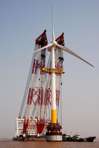 東海大橋風電場是由34臺國內(nèi)單機功率最大的離岸型風電機組組成,總裝機容量10.2萬千瓦,設(shè)計年發(fā)電利用小時數(shù)2624小時,年上網(wǎng)電量2.67億千瓦時,項目總投資23.65億元。經(jīng)過科學測量和論證,這個國內(nèi)首創(chuàng)的海上風電場選址確定在位于上海東海大橋東側(cè)1一4公里、浦東新區(qū)岸線以南8—13公里的上海市海域。這里的平均水深為10米,海面以上的90米高度的年平均風速為每秒8.4米。2009年9月東海大橋風電場首批3臺機組起正式并網(wǎng)發(fā)電,東海大橋海上風電場在建設(shè)中,實現(xiàn)了兩個"首創(chuàng)":